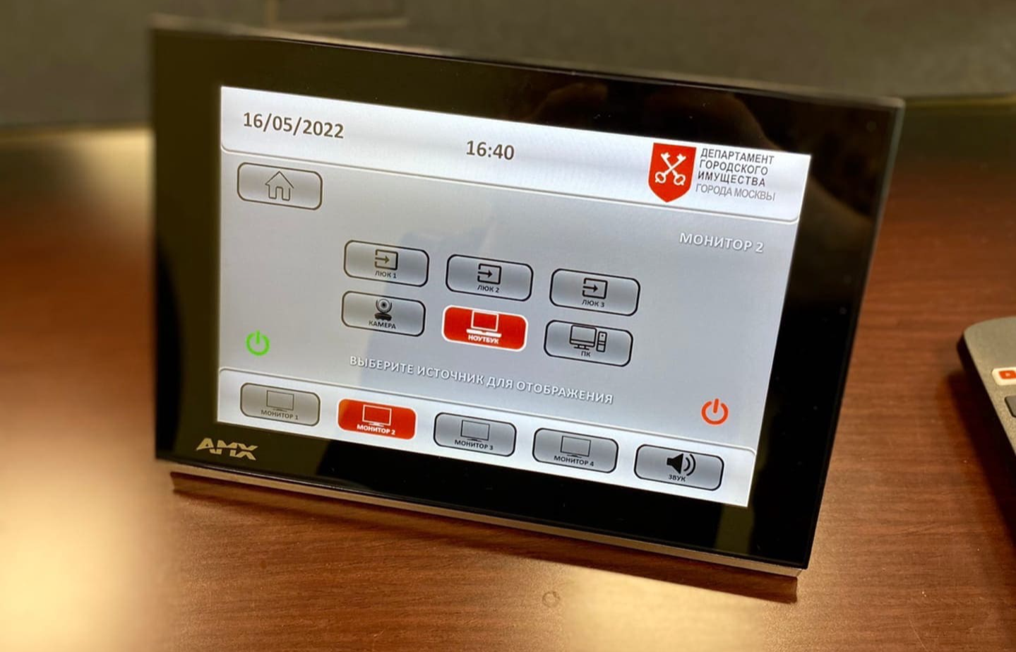В некоторых залах мы использовали систему AMX с панелью управления. Она располагается на столе и обеспечивает быстрый доступ к управлению устройствами и настройкам трансляции. Не нужны дополнительные пульты, что экономит бюджет. Не требуется выполнять дополнительных действий — что экономит время специалистов департамента.
